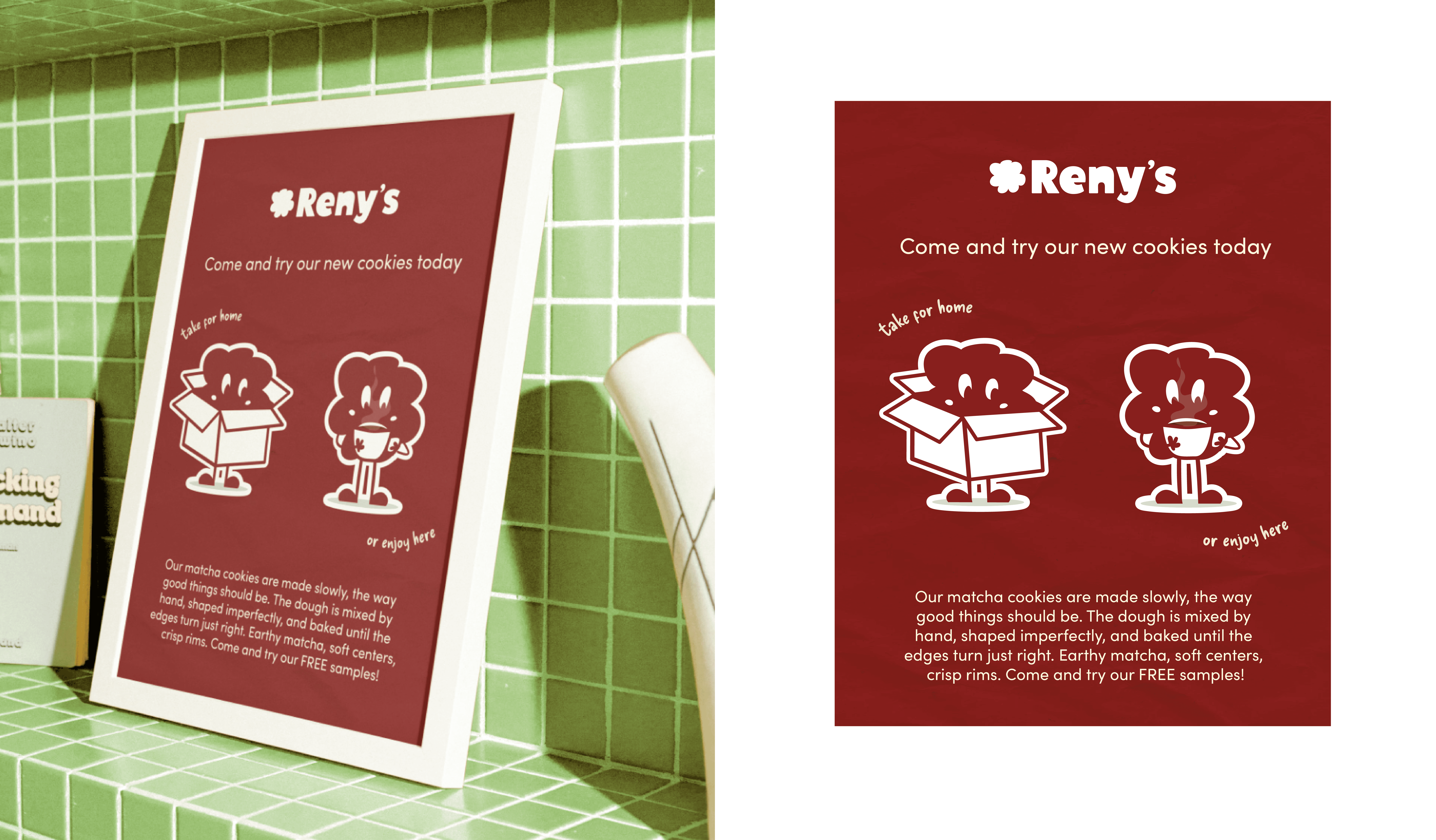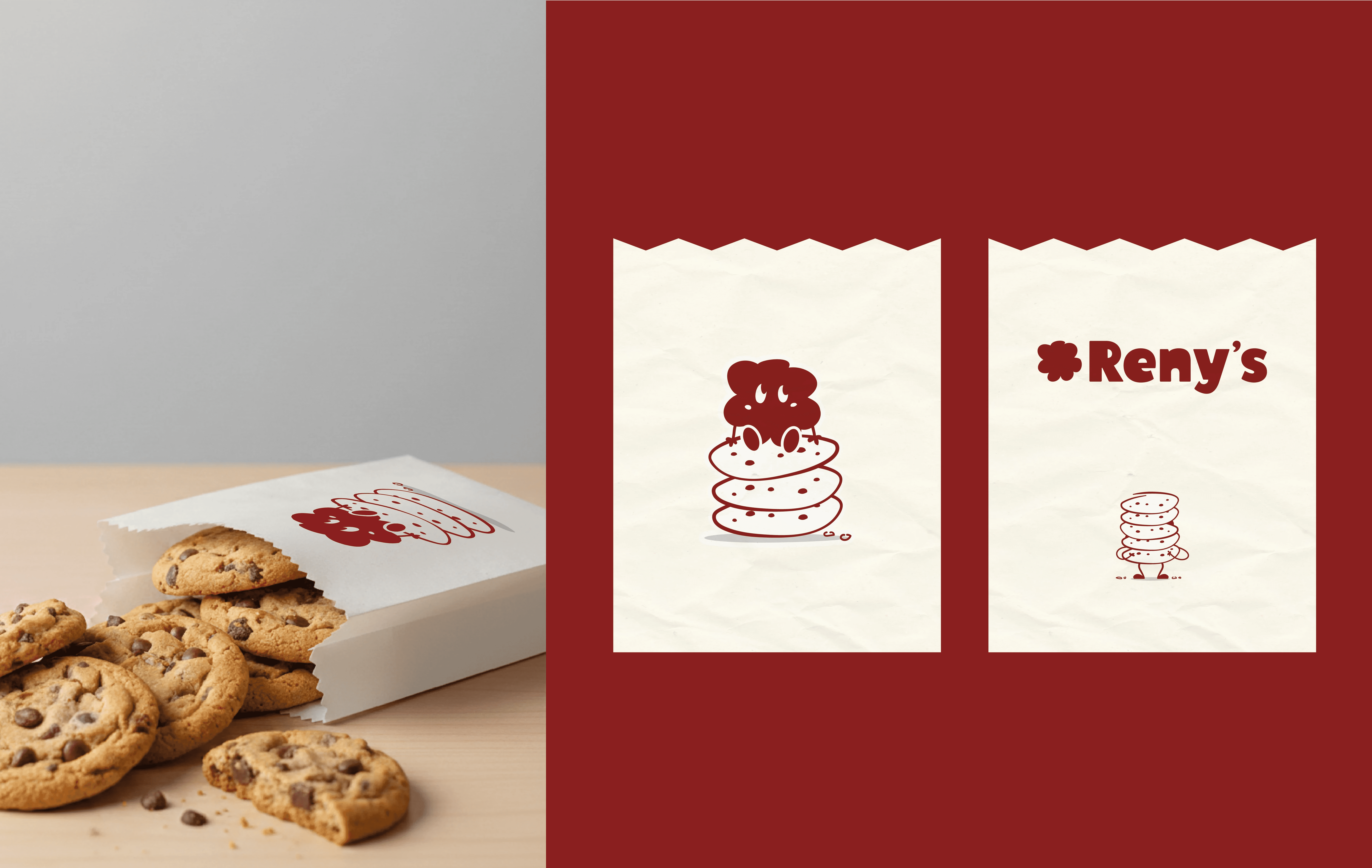 Reny’s is a handmade cookie bakery based in Miami, Florida. We designed the brand to capture warmth and the joy of small shared moments. The identity combines a modern typographic logo with a playful mascot, created as a flexible character that can appear across packaging, social media, and the bakery’s collaborations with local youth events. Bold colour and expressive illustration help the brand stand out in a crowded dessert market, while the mascot allows the identity to adapt across different contexts, creating a visual language that feels contemporary but also friendly, and memorable.